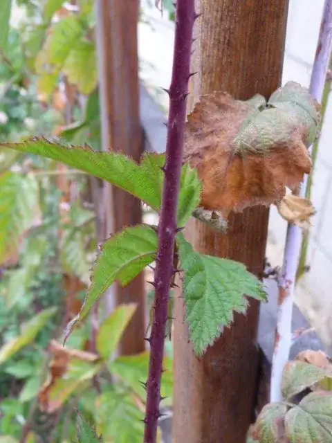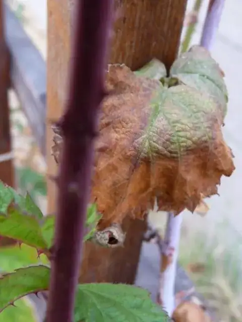 Raspberries are plants that require good exposure to sun. However, my black-raspberry plant has been getting scorched of late. Typical signs of sun-scorching are when the older leaves start drying out (see photo), turning brown and papery (crumbles if you press). The new leaves are unaffected though.