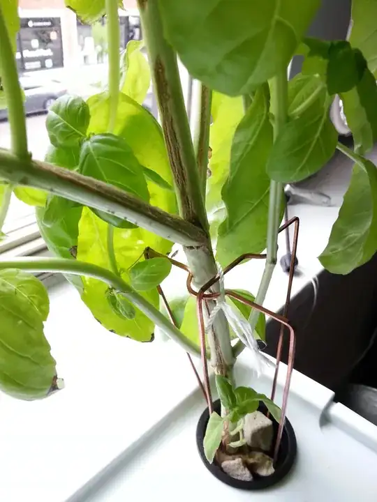 I'm growing Basil indoors hydroponically. Most of my plants look fine (other than them tipping over because I used too small net cups and/or didn't pin them in), but some of the stems appear to be cracking and turning brown (picture below).