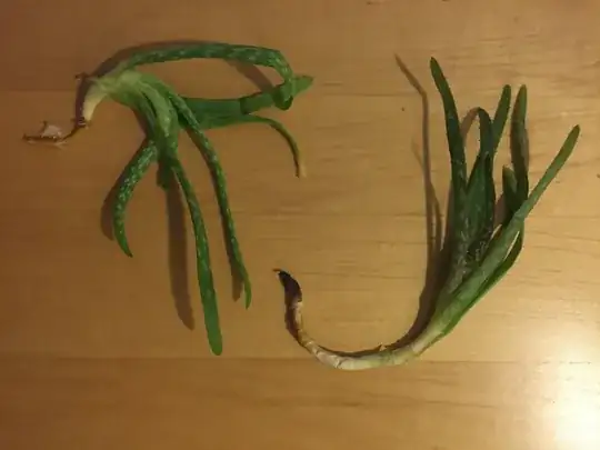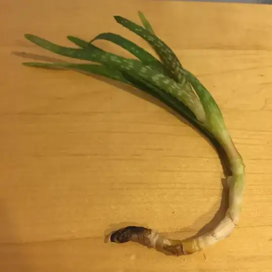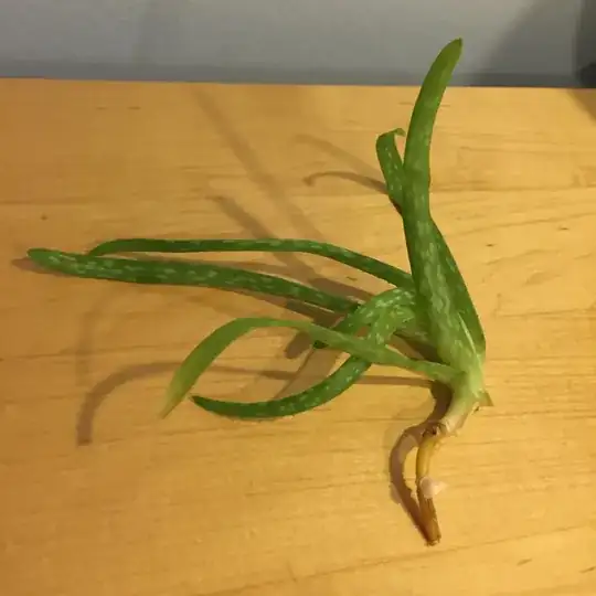 Two succulent Aloe vera shoots easily fell off a friend's aloe plant from readjusting a pot. This plant is potentially under watered and, from looking at the main plant or by just observing the two crowns below, this plant is pretty etiolated and receives little sun.