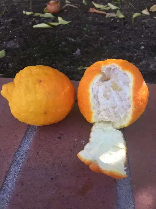 I inherited 3 trees when I bought my house and all three have thorns on the branches with two trees having what appear to be lemons with orange highlights. When opened they have a very thick skin, are easy to peel and have a light orange and lemon smell. They are not sweet and not as tart as a lemon but edible nonetheless. The third tree has what I think are lemons and limes but they are all small and mostly I think to be limes. I cant seem to find any grafting on the trees, however they are over 5 years old.