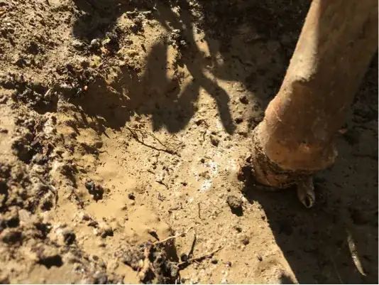 All I've exposed so far are the thin, spindly roots. I used some water to soften the soil.