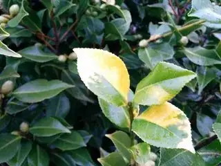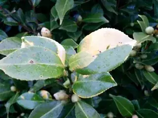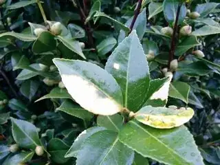 Some of the leaves on my flowering Camellia have yellow patches on them. The discoloration is only on new growth on the south-facing side of the shrub. Some of the leaves show physical damage, but others don't. The Camellia was here when I bought the house, so I don't know what variety it is, but it has pink double flowers.