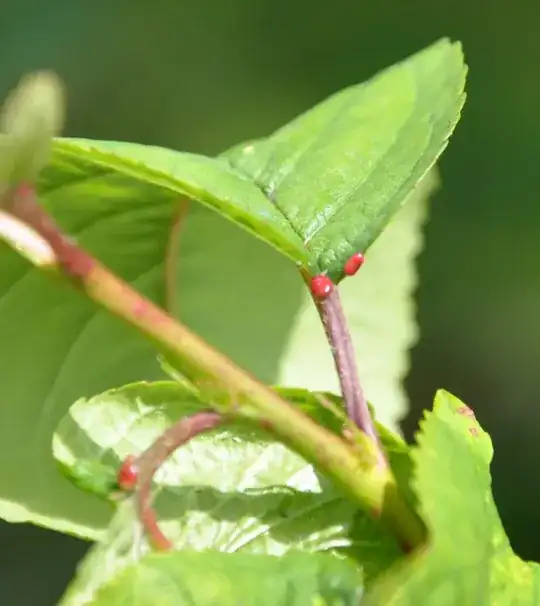 I planted a new cherry tree and it has these small red bumps either side of the stem joint. I have a myriad of insects feeding on them including native bees, flies, ants and ladybirds. At first I thought they were some kind of sap-sucking pest, but research says it's an amazing action by the tree itself to attract beneficial insects.