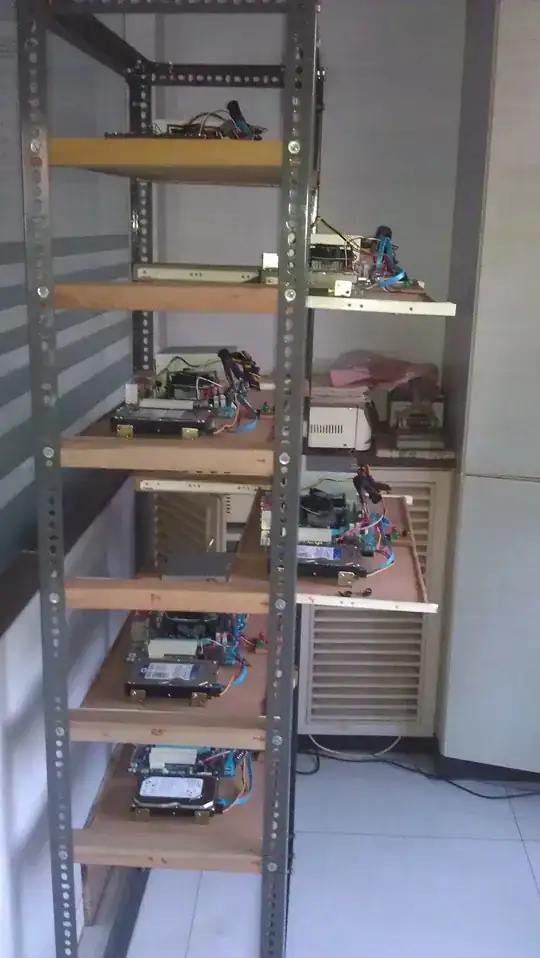 Punch some holes through it, and bolt it to the holes on the uprights. Build about a foot or more higher on the top, cut out a hole and then mount a 12v automotive radiator fan on the top. You'll also want to build in some air-path through the "rack". One way to encourage airflow up and across would be to block alternate shelf-sides, and then build out a "box channel" for it to flow through. Side view.