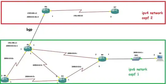 I activate bgp between this 2 networks(R6 and R1) and now R6 can ping the full ipv6 network and R1 can ping the full ipv4 network.