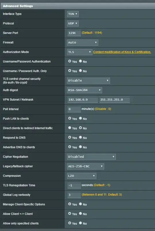 I have an Asus router with Asuswrt-merlin firmware installed. I have the DHCP server on my router give out addresses in the 192.168.0/24 subnet. My OpenVPN server is configured as seen on this image. The VPN subnet / netmask is 10.8.0.0 / 255.255.255.0. The Push LAN to clients, and both the DNS settings are set as shown in the image.