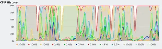 By looking at the us column I see that cpu usage increases linearly as expected up to 6-8 logical cores, but after that it's hitting some other bottleneck. The mouse cursor starts lagging at this point, and if I try running while a videp player is running, it will also starts to stutter at this point. (for comparison, here's the exact same test when done on my work computer: http://pastebin.com/MHPSR4E0 . Here the the cpu usage simply climbs linearly up to 99/100 and stays there (the saturation is on line 8 because it's an 8 core cpu))