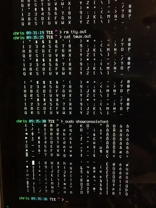 I'm running an arch linux system with no window manager or desktop environment (right now). I use tmux when I need multiple terminals. When I run sudo showconsolefont on my tty (no tmux), I see the expected set of symbols, but when I open tmux and run sudo showconsolefont, I see a different set of symbols that repeats itself.